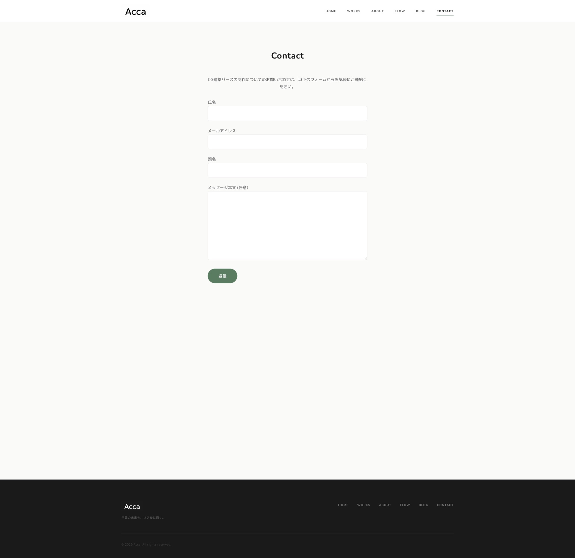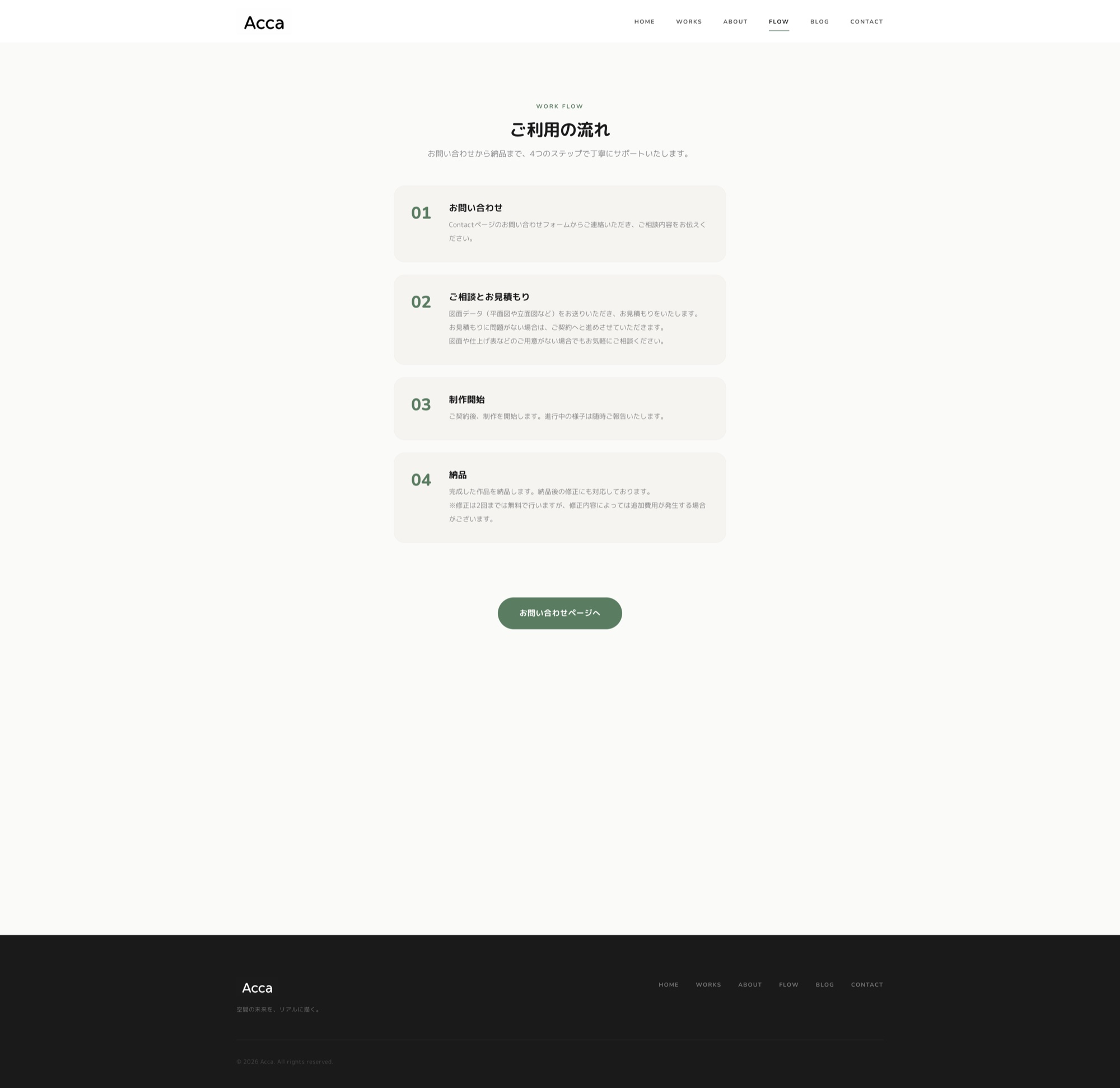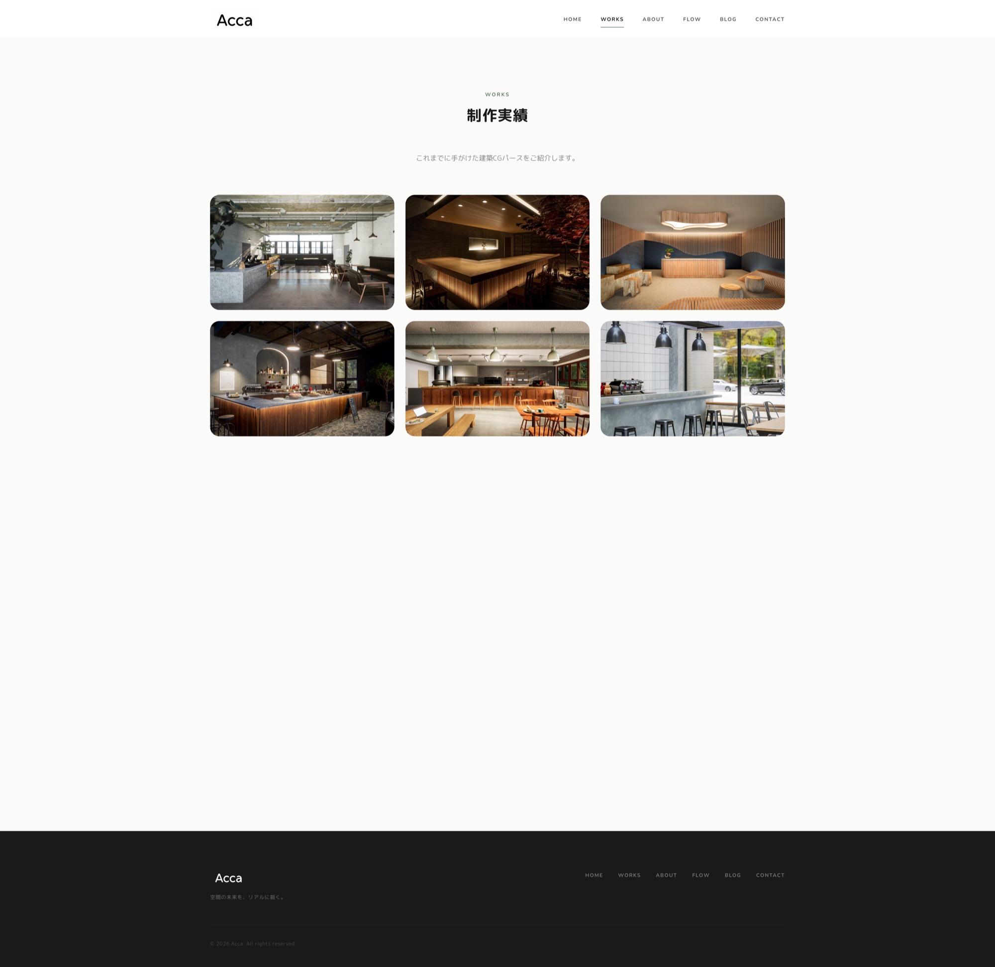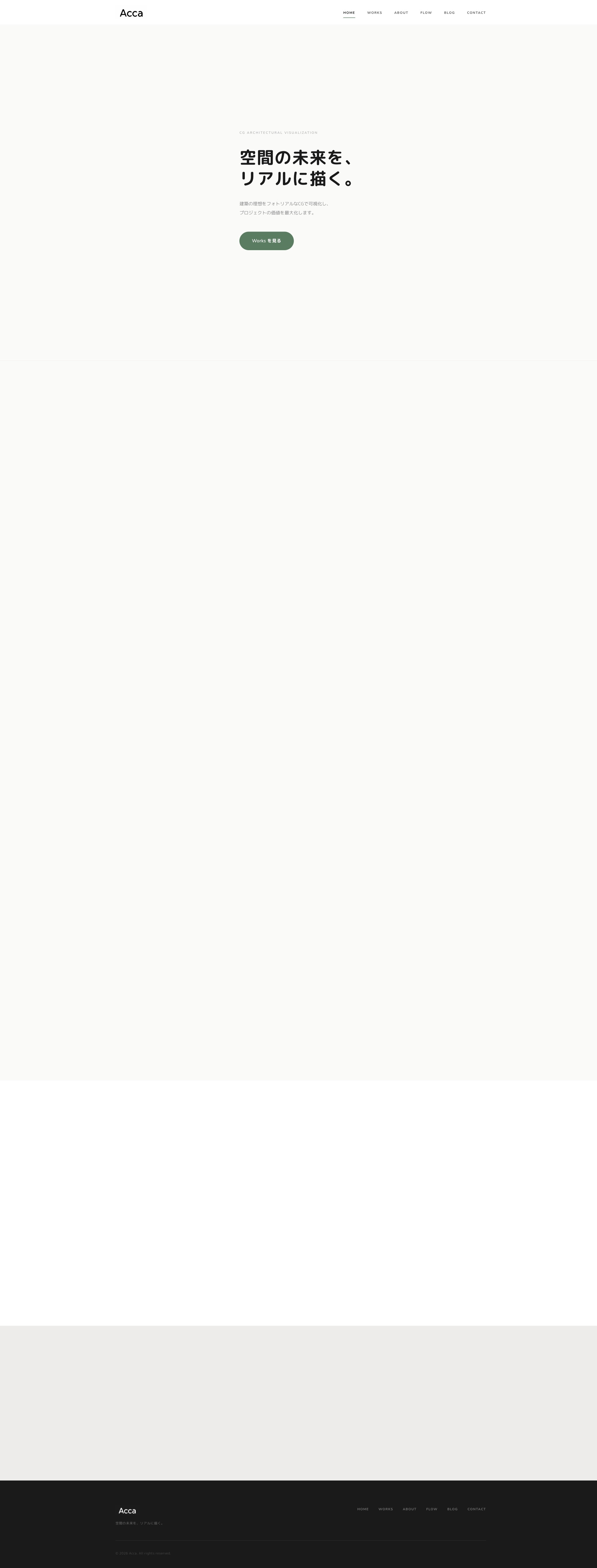 ←Works 一覧へ戻るweb2026Acca建築CGビジュアライゼーション専門スタジオのコーポレートサイト。ミニマルで洗練されたデザイン。※ 架空の企業サイトとして制作したデモ作品です。CategorywebYear2026Tech StackWordPressCustom ThemePHPCSS